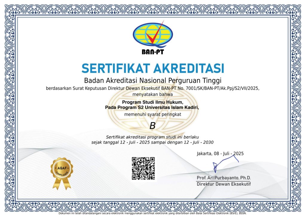 Program Studi Magister Ilmu Hukum Universitas Islam Kadiri (Uniska) Kediri resmi menerima Surat Keputusan Akreditasi terbaru dari Badan Akreditasi Nasional Perguruan Tinggi (BAN-PT) dengan nomor 7001/SK/BAN-PT/Ak.Ppj/S2/VII/2025. SK tersebut menetapkan bahwa Prodi S2 Ilmu Hukum Uniska kembali meraih peringkat akreditasi “B Baca Selengkapnya