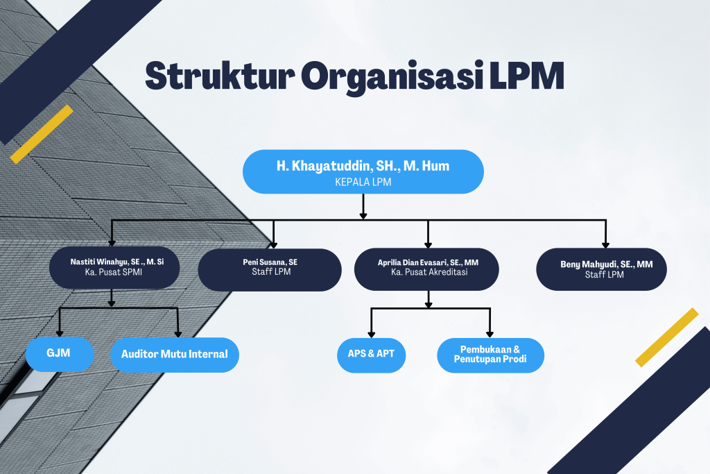 Ismail Marzuki, SH., MH. Staf LPM bagian umum yang menangani administrasi harian, pelaksanaan kegiatan, dan pelaporan lembaga secara menyeluruh.Peni Susana, SE. Staf LPM bagian keuangan dan BKD yang menjalankan tugas administrasi keuangan serta mengelola pengajuan sertifikasi dosen dan BKD.Beny Mahyudi Saputra, SE., MM. Staf LPM bagian penjaminan mutu yang bertanggung jawab atas administrasi harian penjaminan mutu dan laporan kinerja dosen.